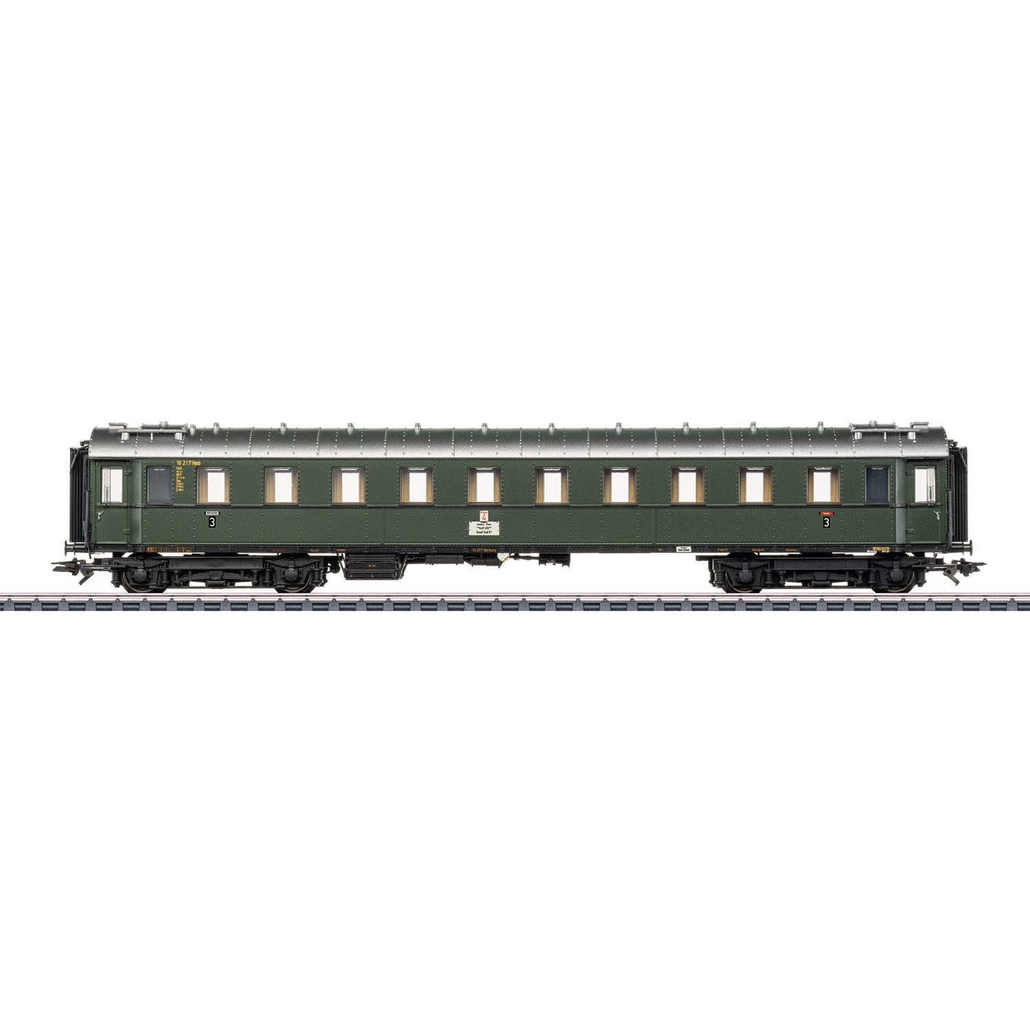 The express train passenger car goes with the class 01.10 express steam locomotive with new tooling and a new boiler design, which is available as item 39105, and can be extended with express train passenger cars from items 42533 and 42491 to create a prototypical D 74 express train.