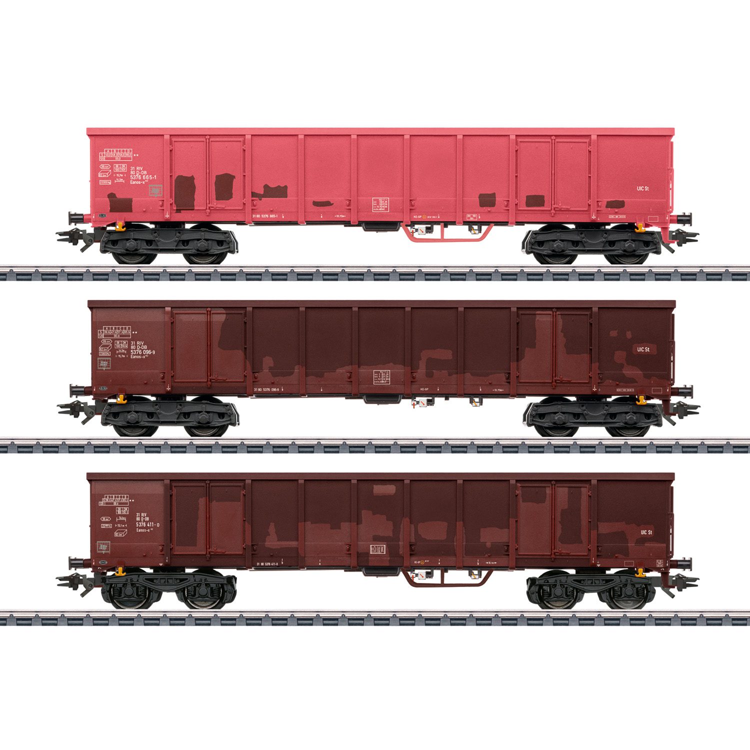 A set of three German Railroad (DB AG) type Eanos-x 056 and Eanos-x 052 high-side gondolas. Different basic paint schemes. The cars look as they did starting in 2019.