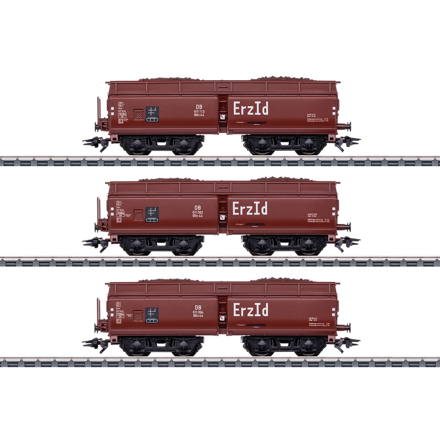 Set of three German Federal Railroad (DB) type Erz Id OOtz 44 four-axle hopper cars. Version with a very low upper superstructure and a brakeman’s platform. Used to transport iron ore. Standard design pressed sheet metal trucks with welded underframes as reinforcement. Reddish brown basic paint scheme. The cars look as they did starting in 1952.