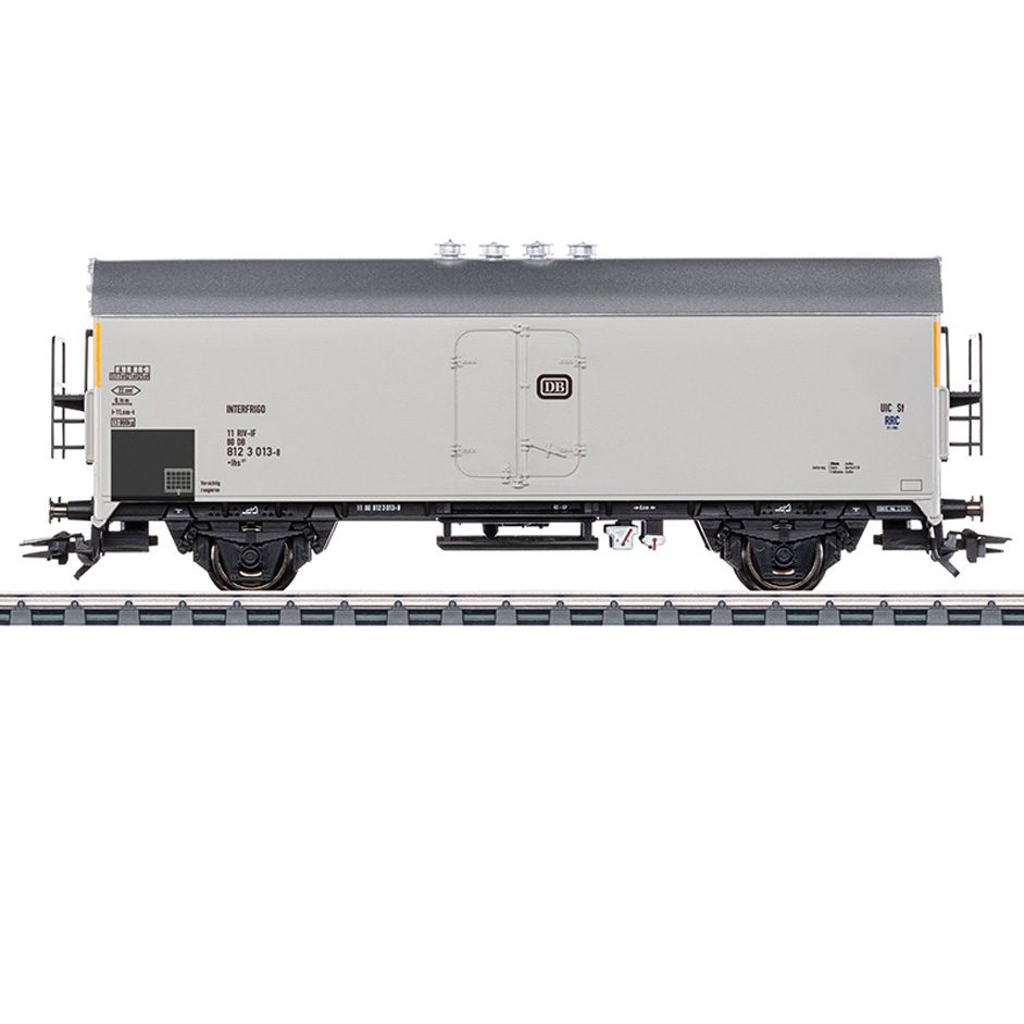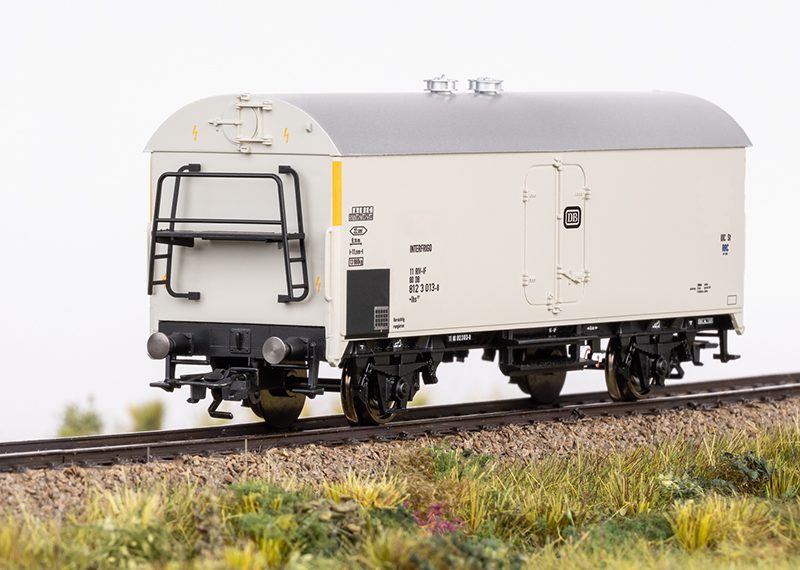 German Federal Railroad (DB) type Ibs 377 (former Tehs 50) 2-axle refrigerator car. Boarding platforms included on the car ends. Gravel gray basic paint scheme. The car looks as it did around 1983.