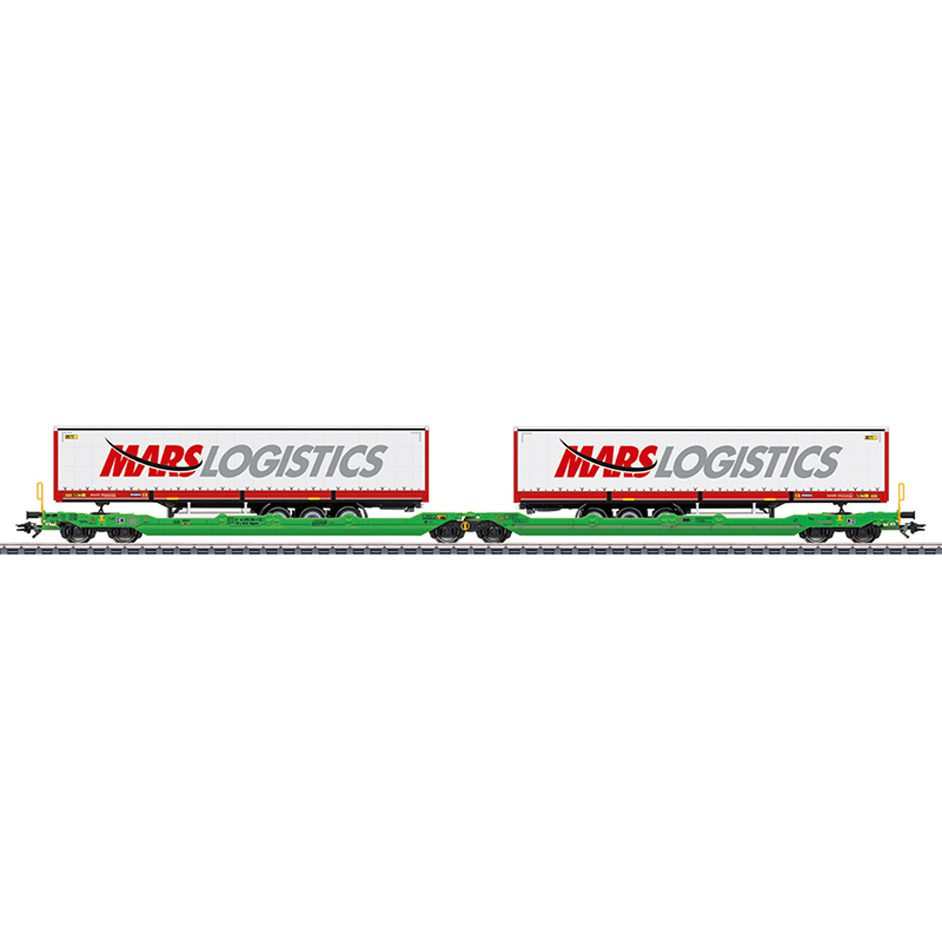 Both flat car halves are constructed of metal and are mounted to pivot on the middle truck. Side folding tie bars are installed at the factory. The cars can be folded for the transport of containers or interchangeable bodies. There are many separately applied details such as steps, brake lines, and grab irons at the ends of the cars. The trucks are type Y25. The buffer height conforms to the NEM. There is a pocket for holders for high and low version kingpins, brakeman’s steps, and an air tank for the ends of the cars included separately as parts for installation on the cars. The cars are loaded with two curtain tarp semi rigs lettered for the freight forwarder Mars. Length over the buffers approximately 39.3 cm / 15-1/2″. DC wheelset E700580.