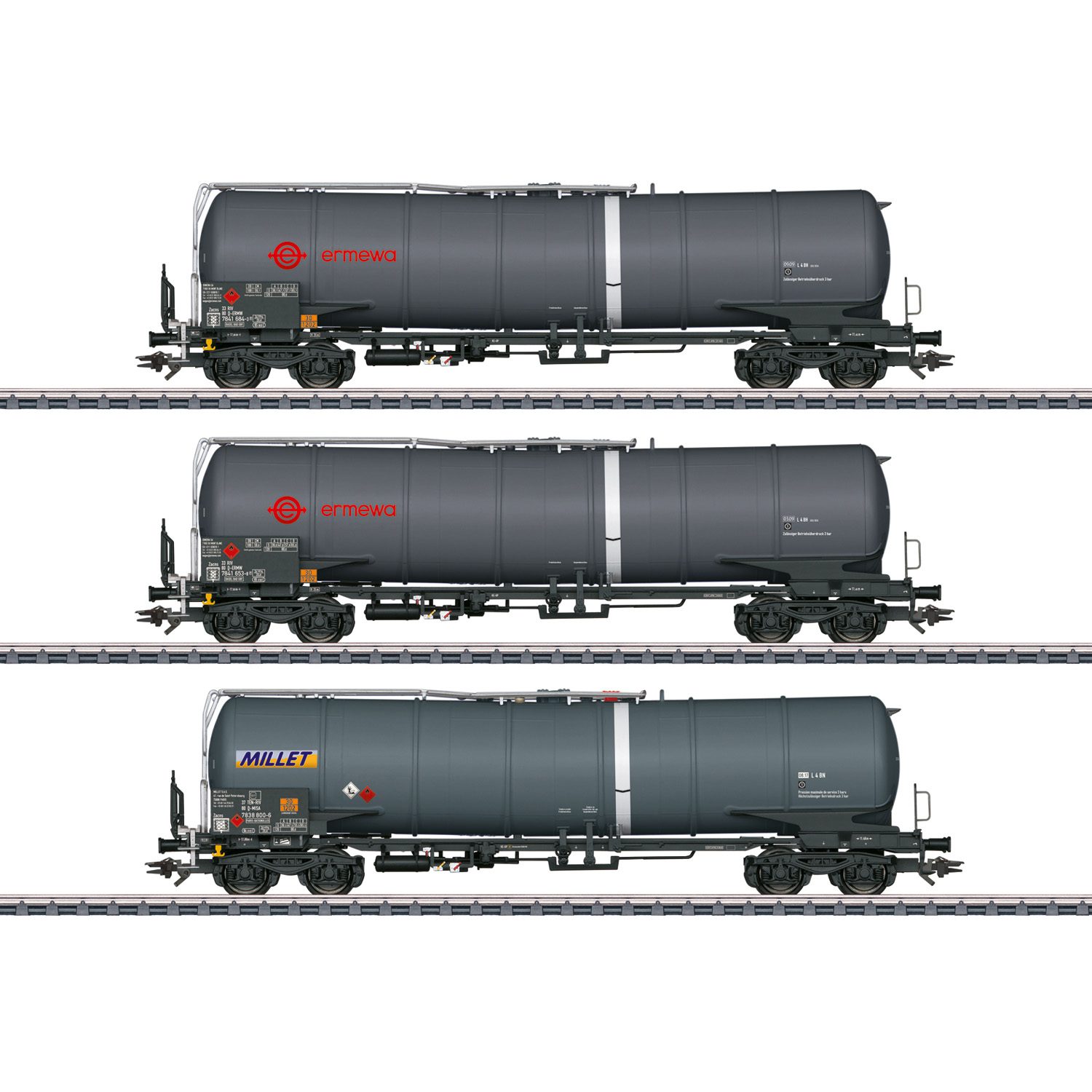 Three type Zacns tank cars with a capacity of 95 cubic meters / 25,096 gallons. Two privately owned cars of Ermewa SA, one privately owned car of Millet SAS. All cars are registered in Germany. The cars look as they did around 2009.