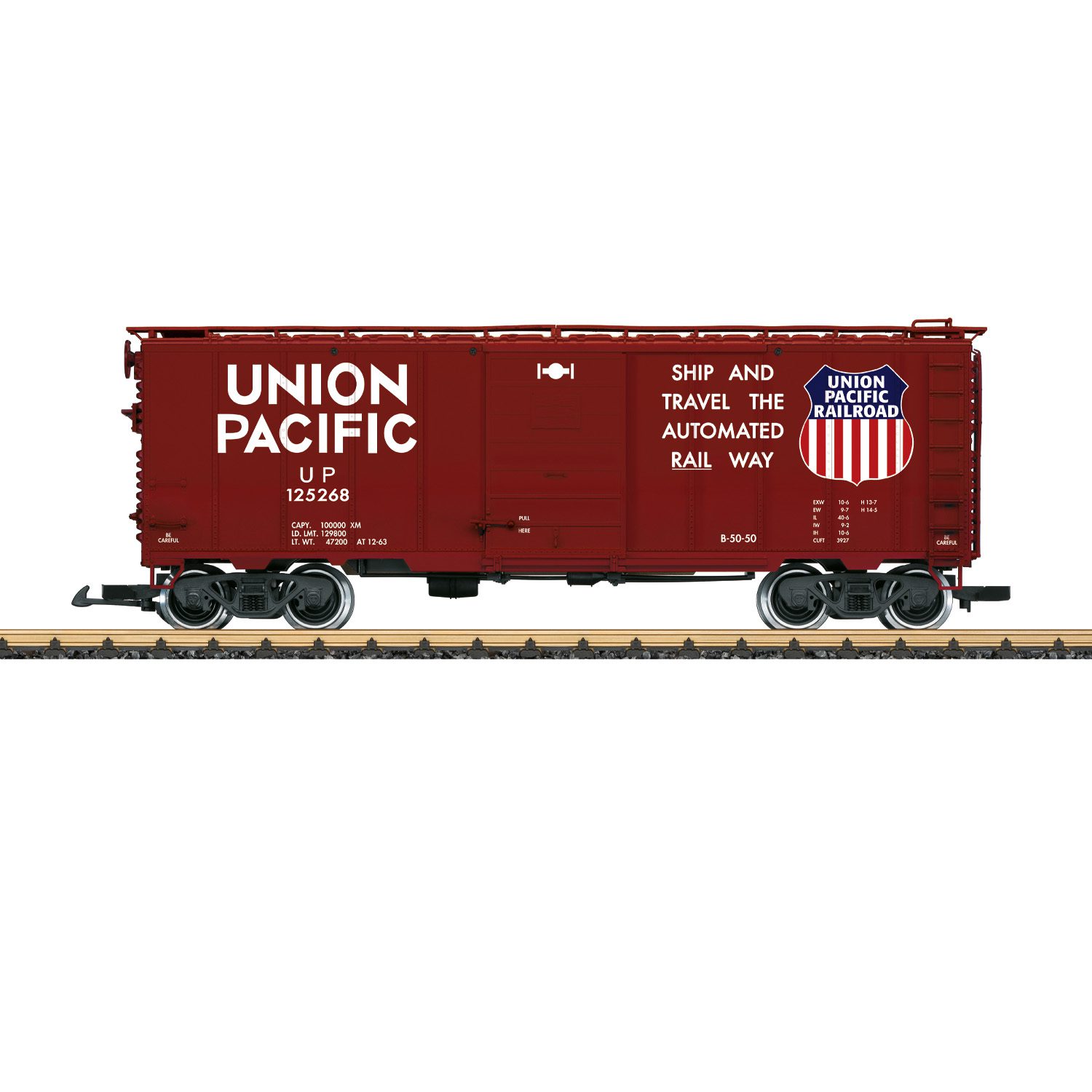 This is a model of a Union Pacific boxcar. The brown paint scheme and lettering are correct for Era III. There are many separately applied details, and the sliding doors can be opened. There are metal wheelsets. Length over the couplers 46 cm / 18-1/8″.