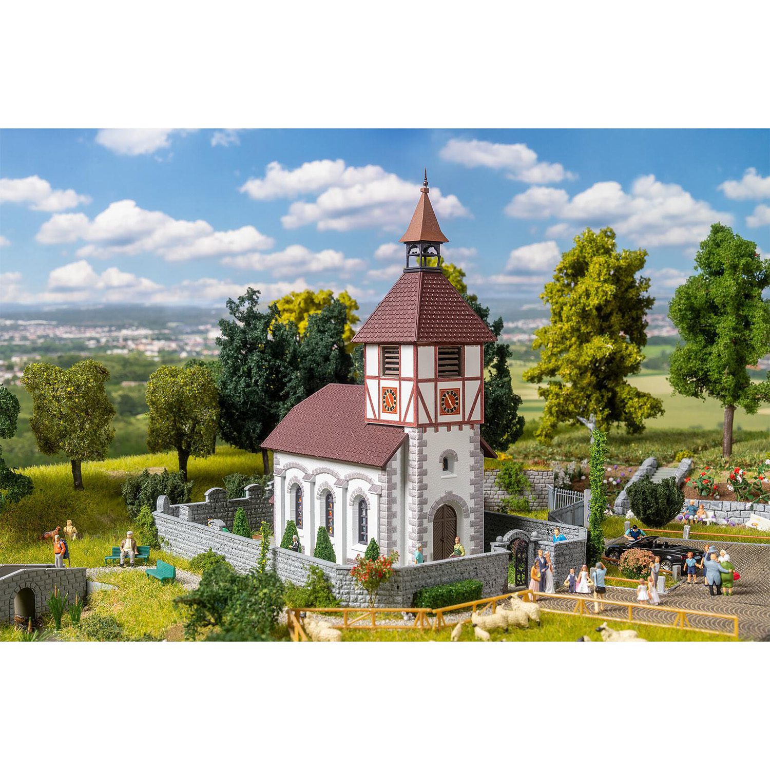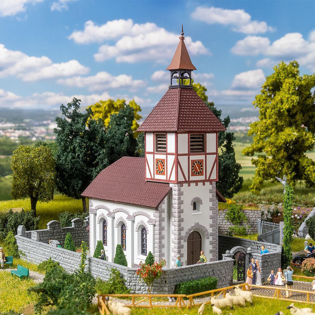 A cosy village church with white plaster, grey stone edges and brown bricks stretches its steeple out over the miniature roofs and looks quietly and reverently over the small cemetery and courtyard that surrounds it. A rustic wooden gate and a staircase open the way into the church, which is surrounded by a protective stone wall.