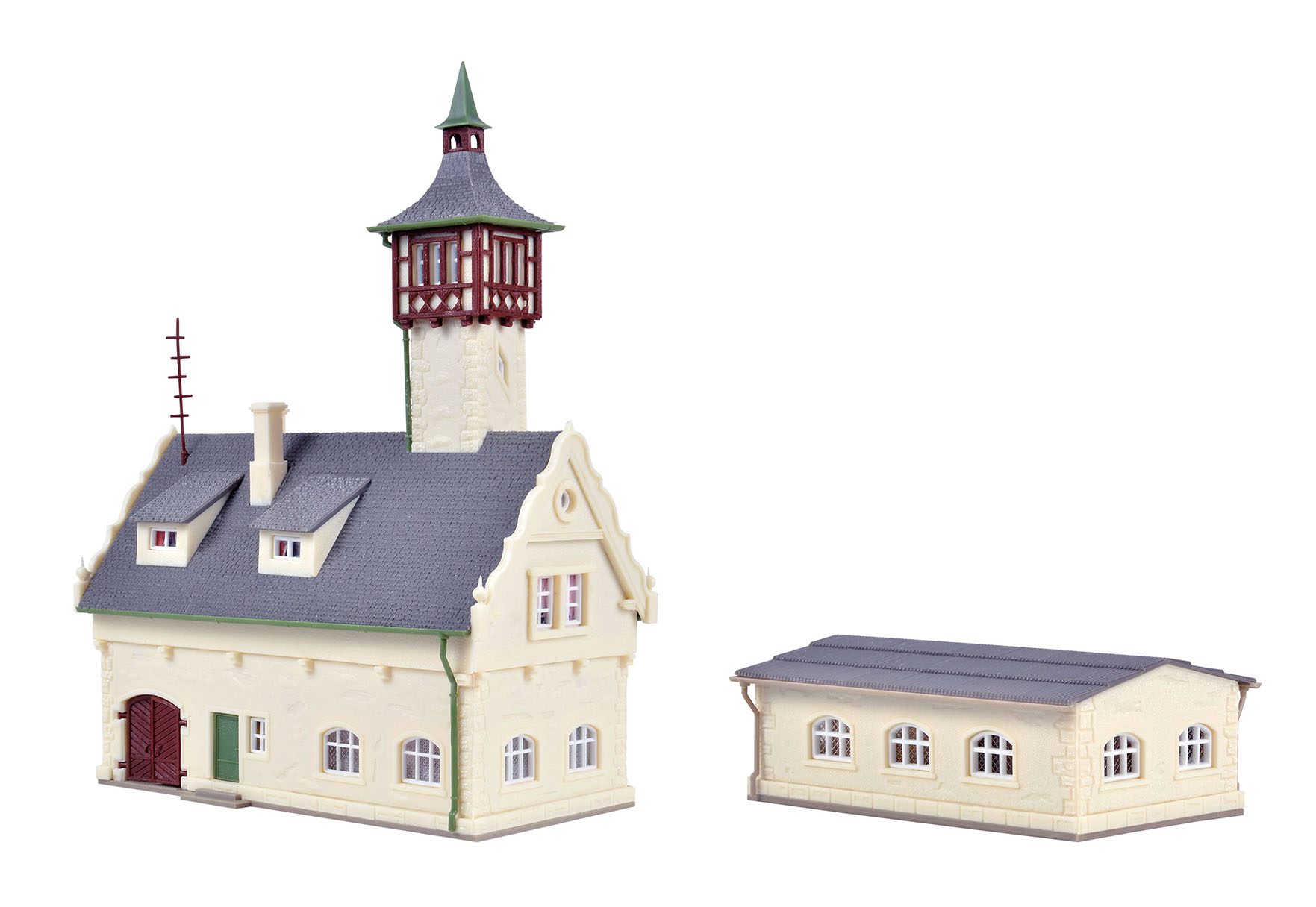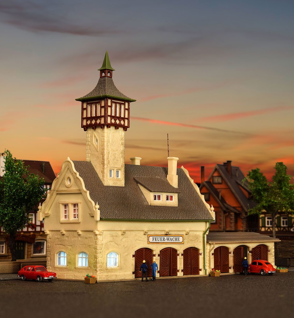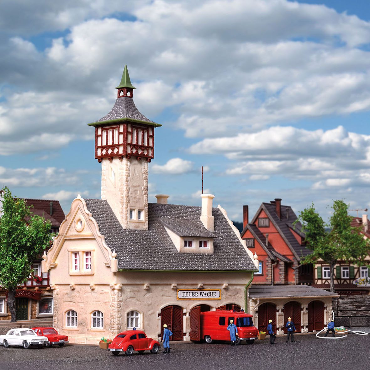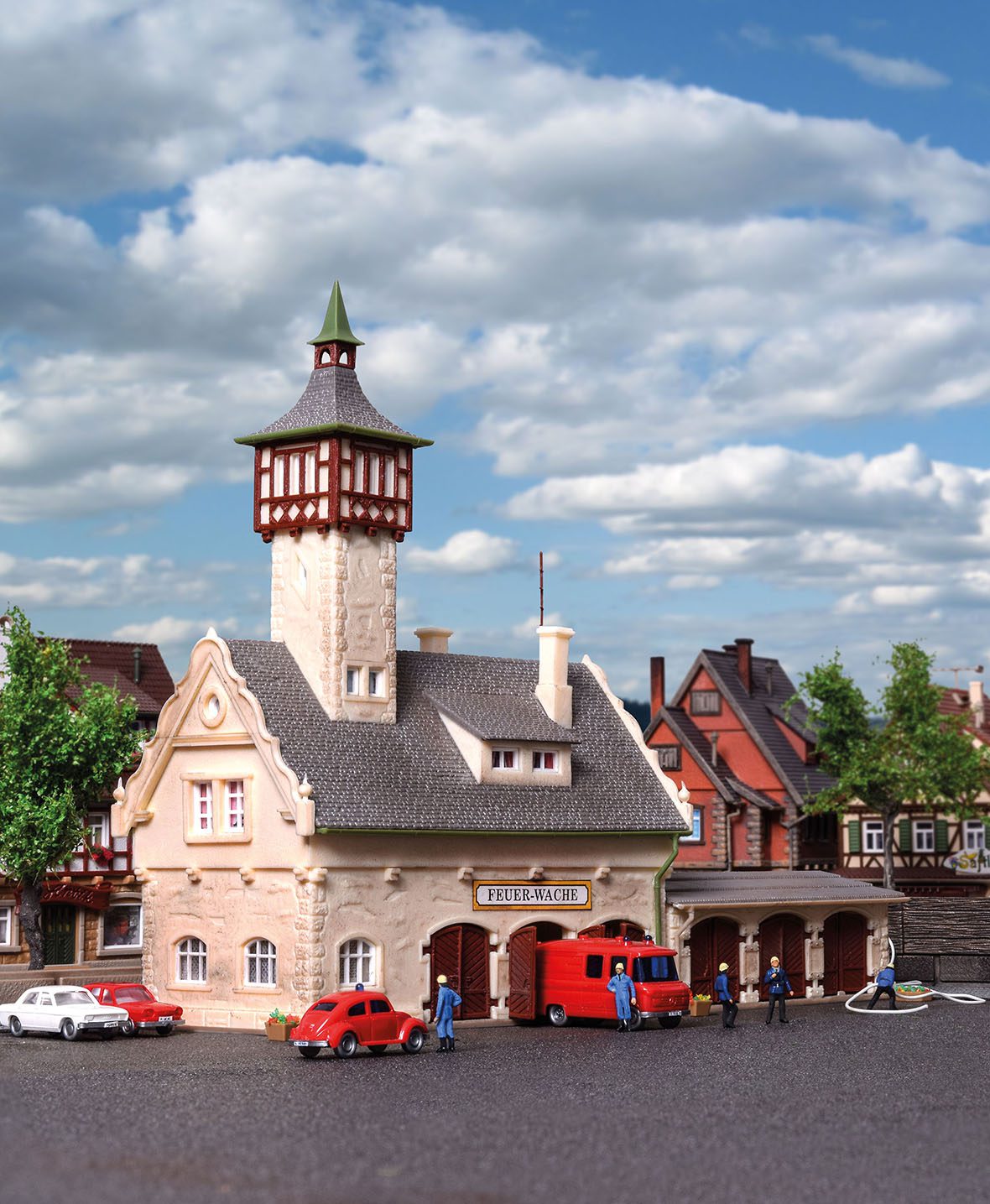 In such buildings 6 fire trucks find location and an impressive tube tower adorns this nice building. Dimensions village fire brigade: L 10.5 x W 5.7 x H 14 cm. Garage: L 7.5 x W 5 x H 2.8 cm. Gate: L 1.5 x H 1.7 cm.
