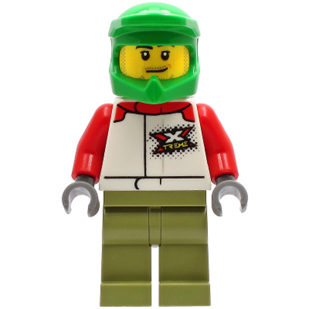 Wheelchair Athlete – Male, White and Red Racing Suit with ‘XTREME’ Logo, Olive Green Legs, Bright Green Dirt Bike Helmet, Stubble